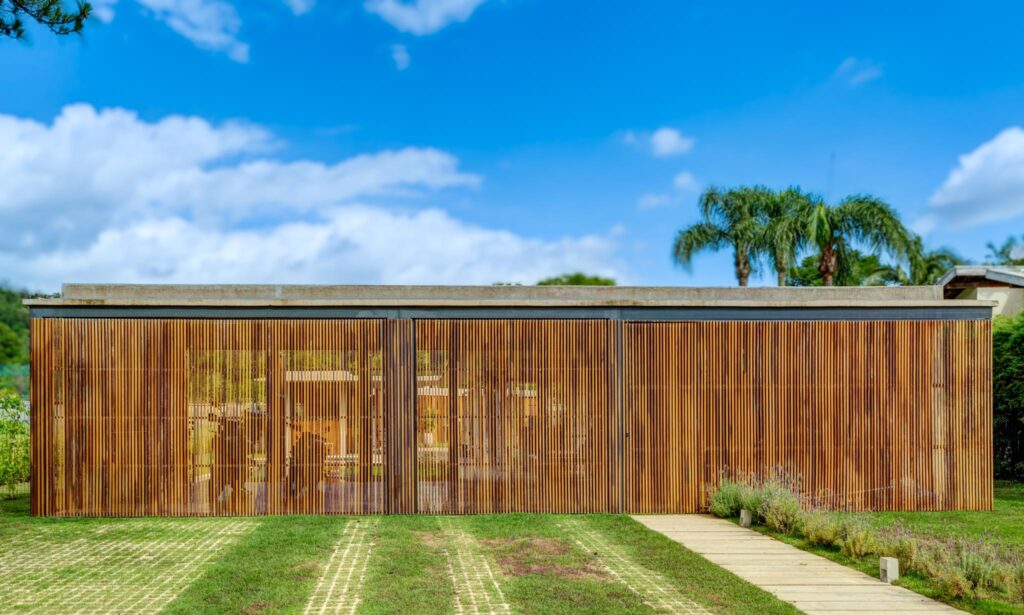 A ordenação dos ambientes segue uma lógica hierárquica de usos. Voltado à rua, o primeiro volume abriga o hall de acesso, a garagem e a sauna. Este espaço é envolto por painéis de madeira ripada com diferentes mecanismos de abertura: portões basculantes para a garagem, porta de pedestre e painéis pivotantes voltados à piscina. Quando fechados, os painéis tornam-se coplanares, compondo um único plano contínuo e neutro. Essa solução reforça a intenção de flexibilidade do espaço, cuja amplitude permite múltiplos modos de uso.