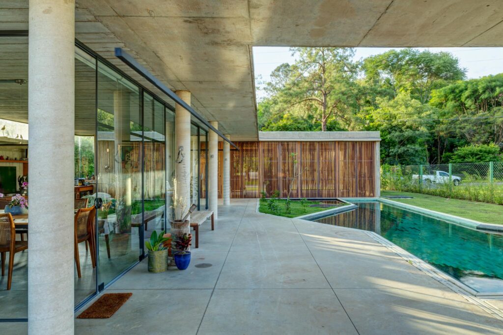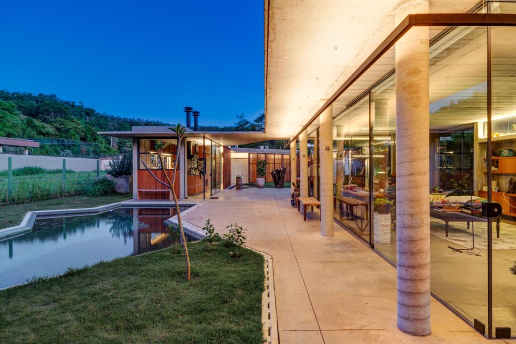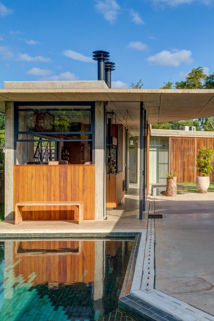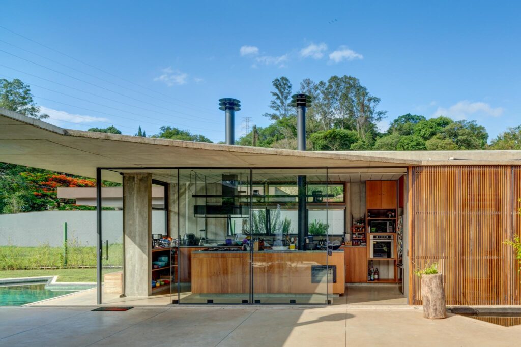 Perpendicular a esse primeiro volume situa-se o estar, cuja fachada principal se abre inteiramente para a piscina. No extremo oposto, o volume da cozinha conecta-se ao setor íntimo por meio de uma circulação protegida por caixilhos, garantindo conforto e integração visual.
