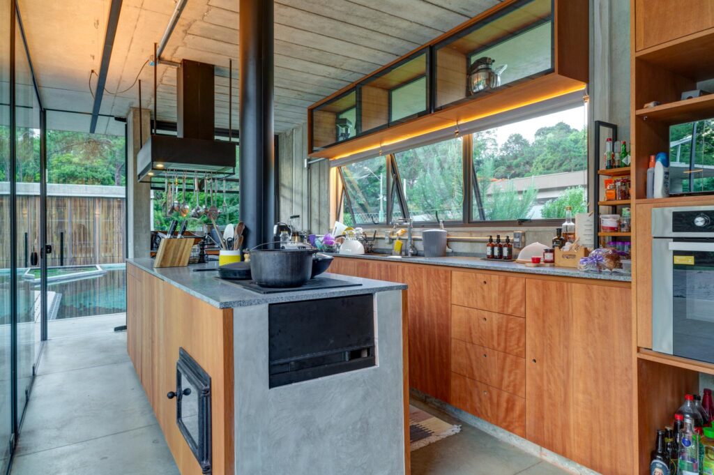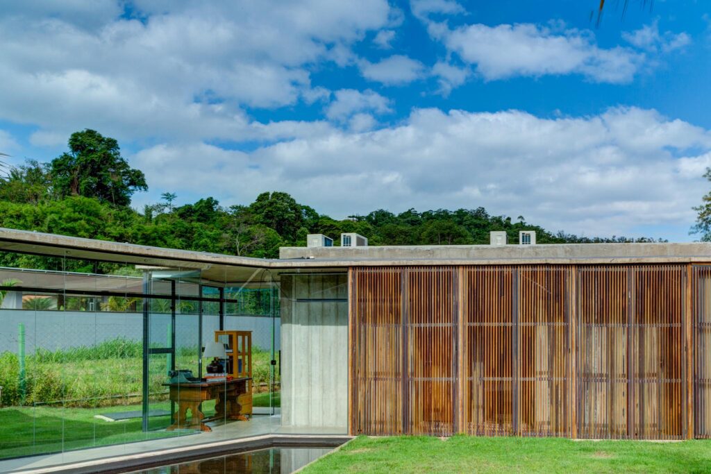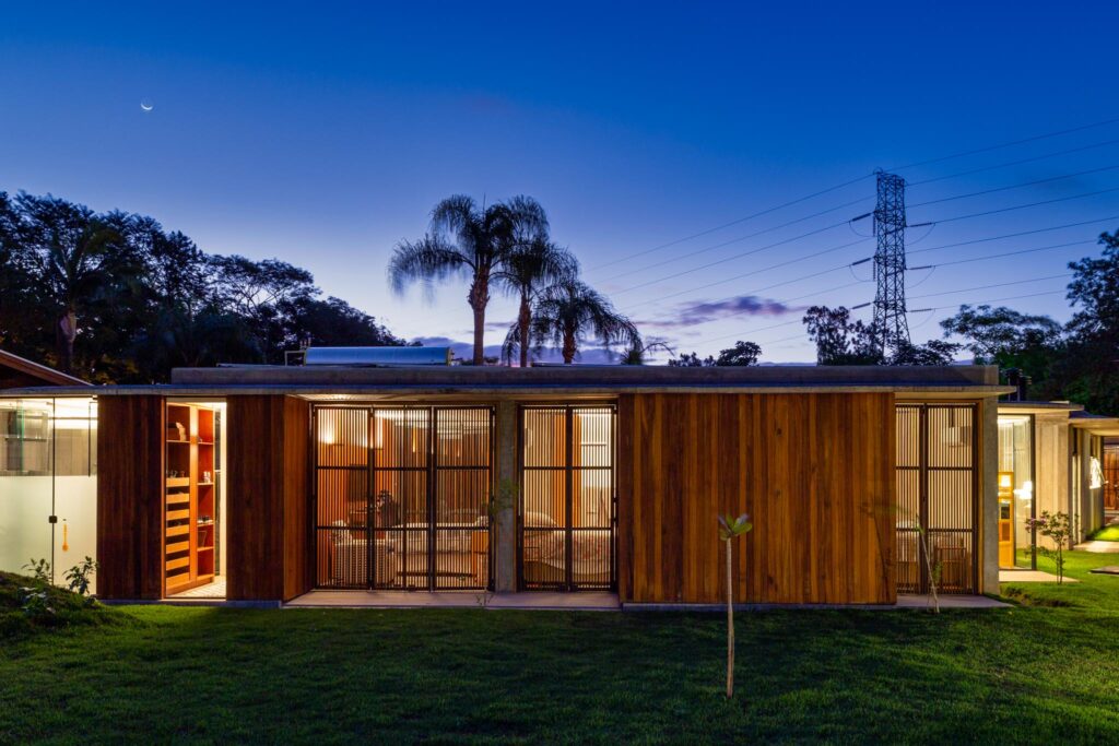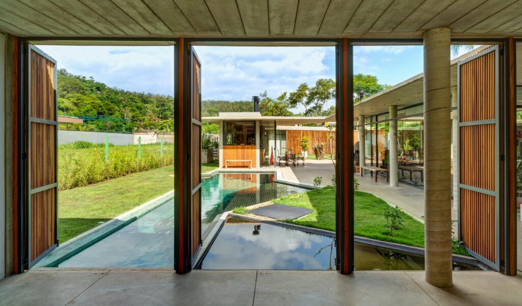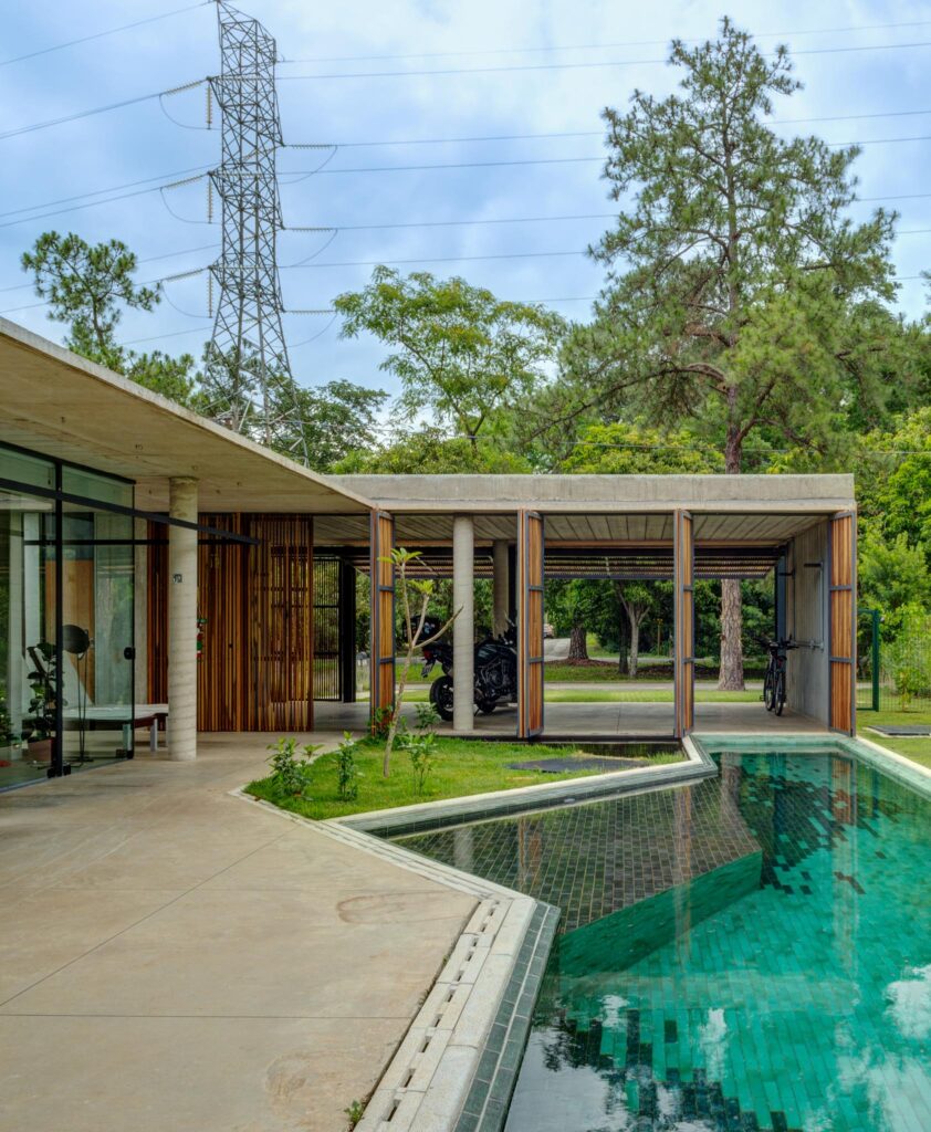 Perpendicular a esse primeiro volume situa-se o estar, cuja fachada principal se abre inteiramente para a piscina. No extremo oposto, o volume da cozinha conecta-se ao setor íntimo por meio de uma circulação protegida por caixilhos, garantindo conforto e integração visual.