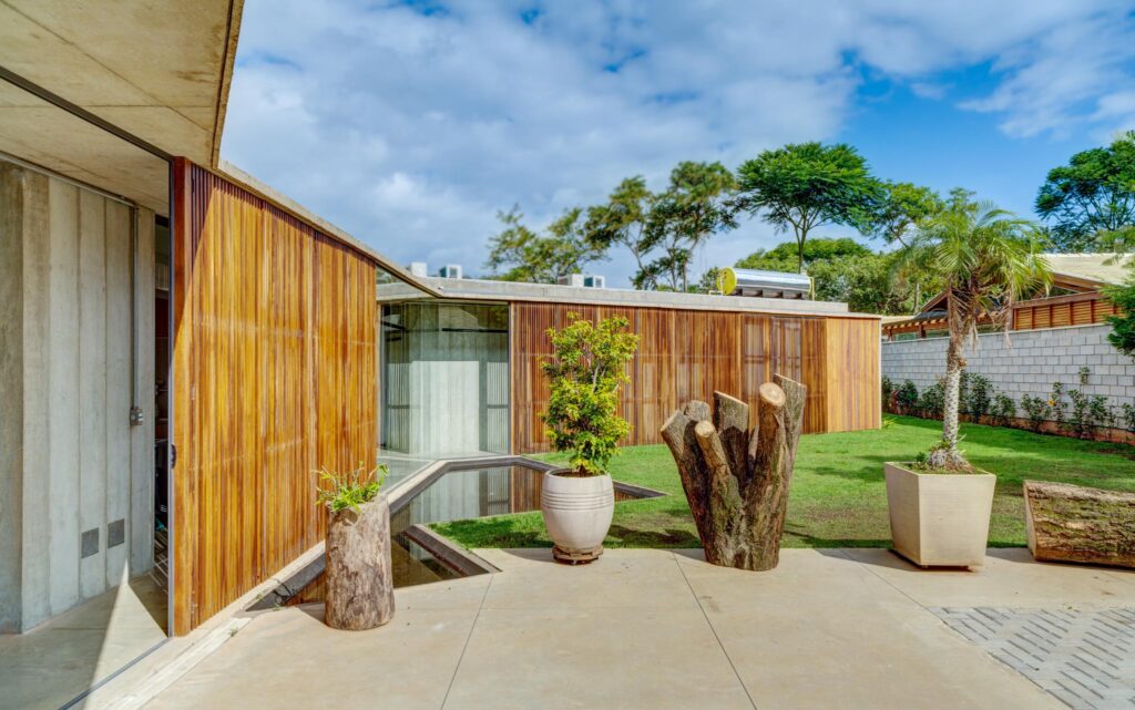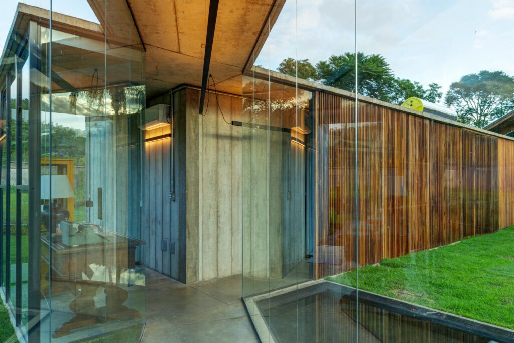 A construção se apoia essencialmente em três materiais: concreto, vidro e madeira. Espera-se, contudo, que um quarto elemento — a vegetação — venha a se integrar plenamente à arquitetura. No tempo, ela deverá atravessar e suavizar as transições entre os ambientes, reforçando uma intenção recorrente em nossas investigações: provocar o encontro entre o dentro e o fora acentuando a vocação natural do lugar. Essa condição, própria ao clima brasileiro, abre mão da necessidade de que todo espaço tenha que ser hermético e condicionado, propondo uma morada que confere o mesmo peso de importância dos espaços construídos para os não construídos.
