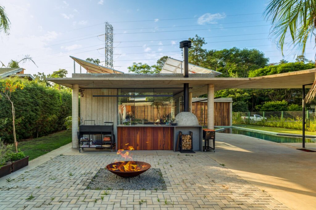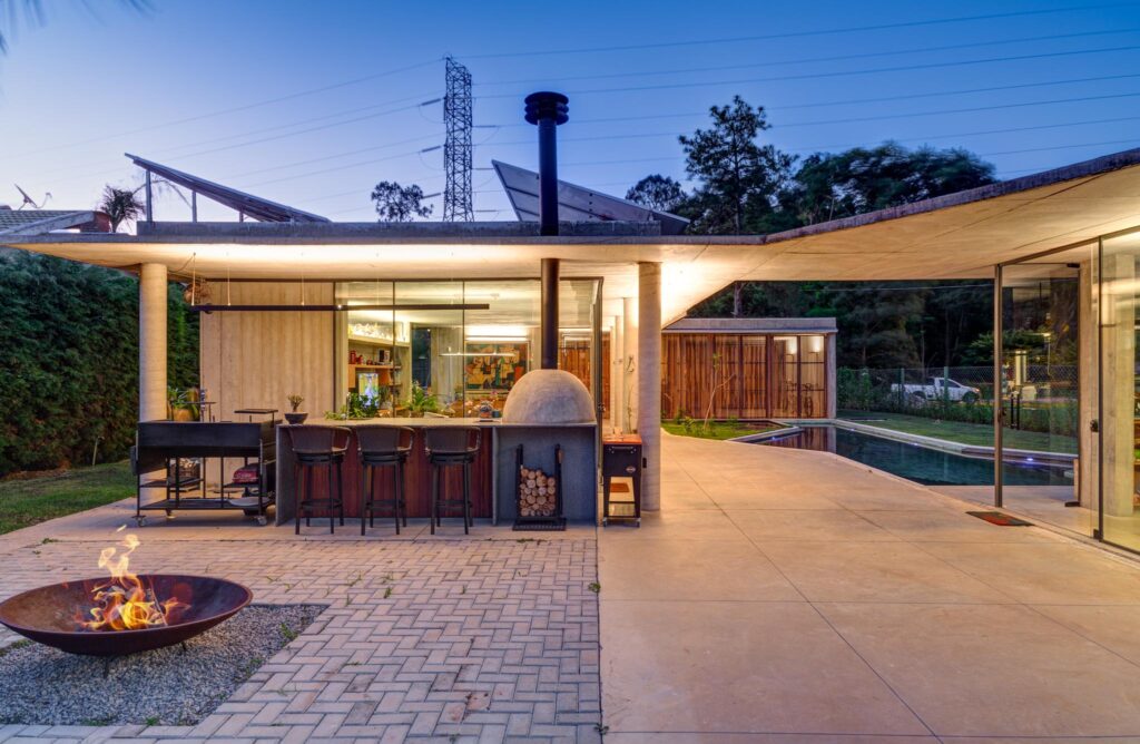 Vista do alto, a casa pode ser lida como uma grande laje que percorre o terreno como uma marquise de geometria irregular, moldada pela disposição dos ambientes. Essa cobertura contínua organiza o conjunto, alternando espaços fechados e abertos — piscina, pátio e áreas de estar externas —, de modo a favorecer a transição fluida entre as partes. No centro do pátio, um recorte circular abriga a fogueira, elemento de reunião e permanência.